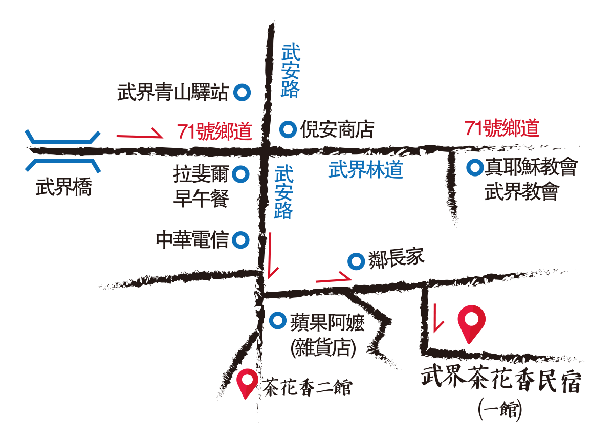 •公車:埔里轉運站→搭乘客運前往武界法治村班車→於武界法治村車站下車後步行抵達「武界茶花香民宿」